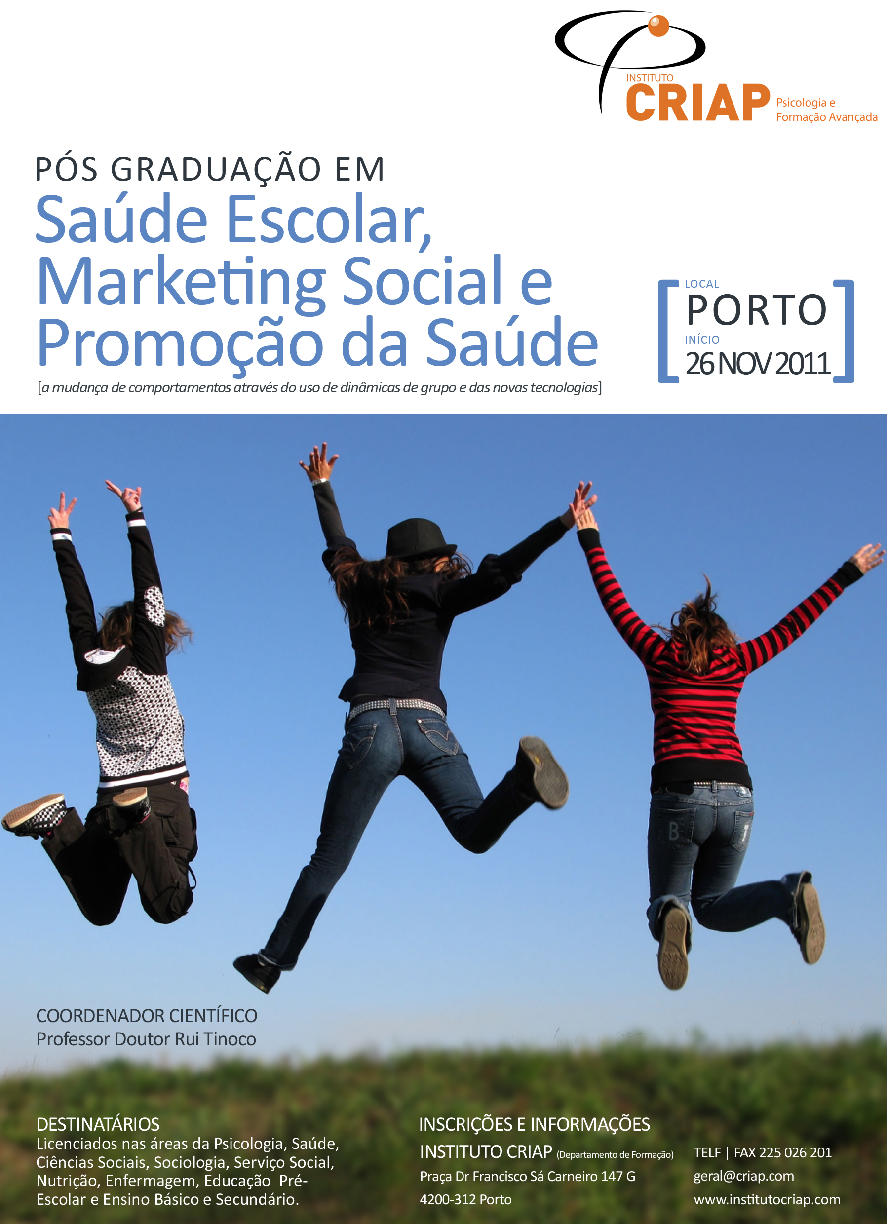 Pós-Graduação em Saúde Escolar. Marketing Social e Promoção da Saúde. Organizaão do CRIAP – Porto, novembro de 2011. Conta com um número de formadores e docentes de relevo em áreas de especialização pertinentes para este cruzamento de saberes que preside a esta ós-graduação.