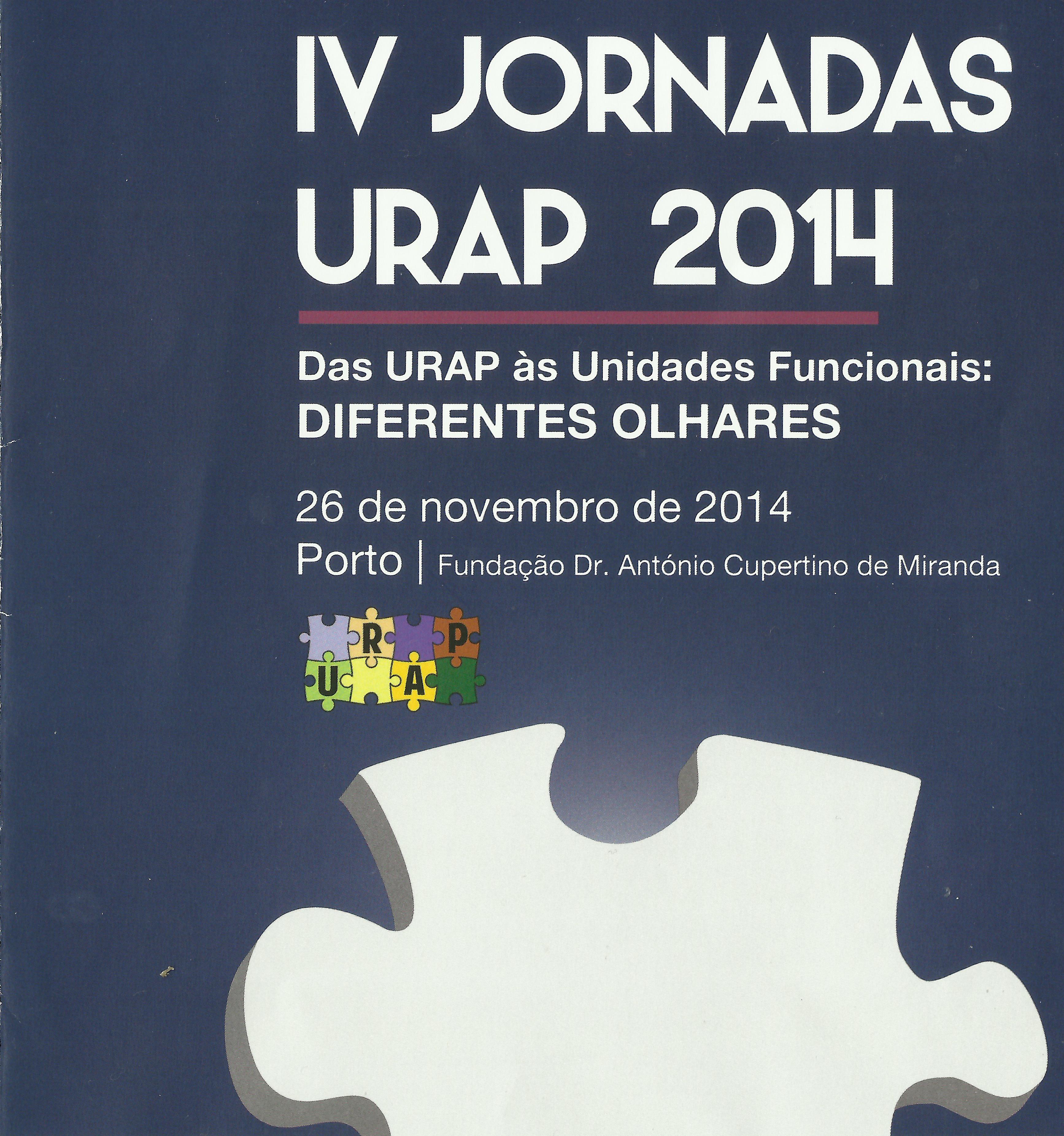 IV Jornadas das URAP, evento a ocorrer no próximo dia 26 de novembro de 2014 na Fundação Dr. António Cupertino de Miranda. A URAP é a unidade funcional do interior dos Agrupamentos de Centros de Saúde que contextualiza o trabalho da psicologia nos cuidados de saúde primários.