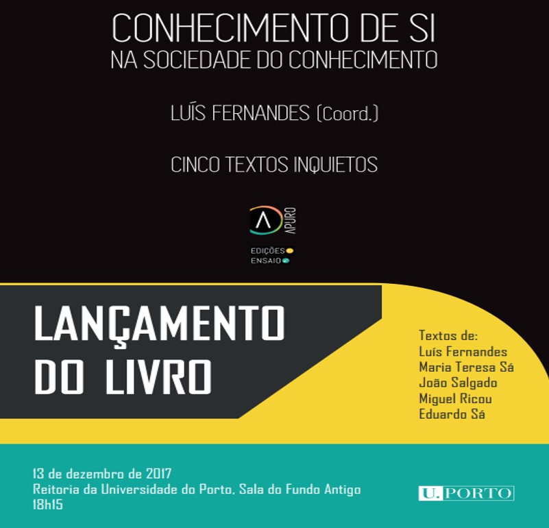 Na quarta-feira, 13 de dezembro, será lançado o livro “Conhecimento de Si na Sociedade do Conhecimento – Cinco textos inquietos”, coordenado por Luís Fernandes. O livro reune textos de Luís Fernandes, Maria Teresa Sá, João Salgado, Miguel Ricou e Eduardo Sá.